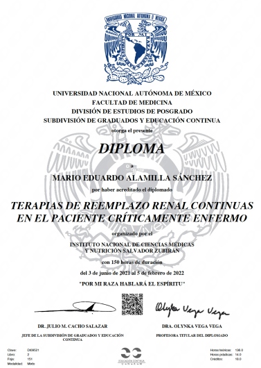 5.- Diplomado en Terapias de Reemplazo Renal Continuo en el Instituto Nacional de Ciencias Médicas y Nutrición Salvador Zubirán (2022).